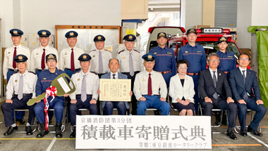 日本のロータリークラブ100年および、福原ガバナー年度の記念事業として、地元京橋消防団第3分団に可搬式ポンプ積載車を寄贈し、東京消防庁消防総監より感謝状をいただきました。